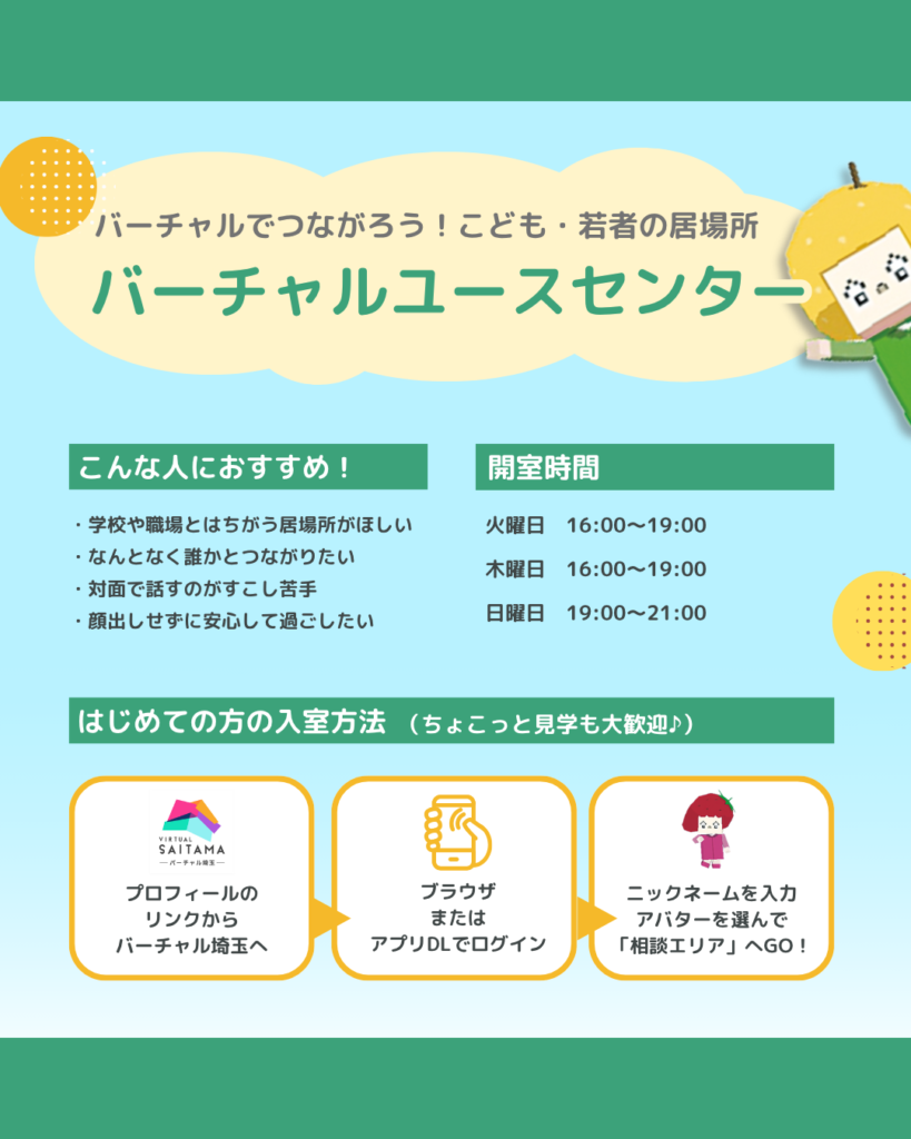 【埼玉県バーチャルユースセンターは、埼玉県の委託により認定NPO法人さいたまユースサポートネットが運営しています】