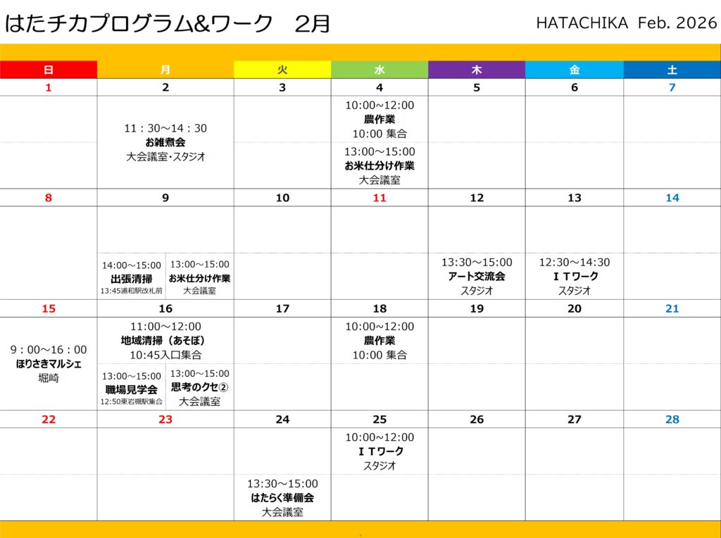 2月のお楽しみイベントは毎年恒例の「お雑煮会」です!その他、これまでも多くの方々にご協力いただいている「ほりさきマルシェ」も開催します♪はたチカスタッフも全員参加しますので、一緒に楽しみましょう。また、職場見学会もおこないます。少しでもご興味、関心のある方は、お気軽にスタッフにお声がけください。