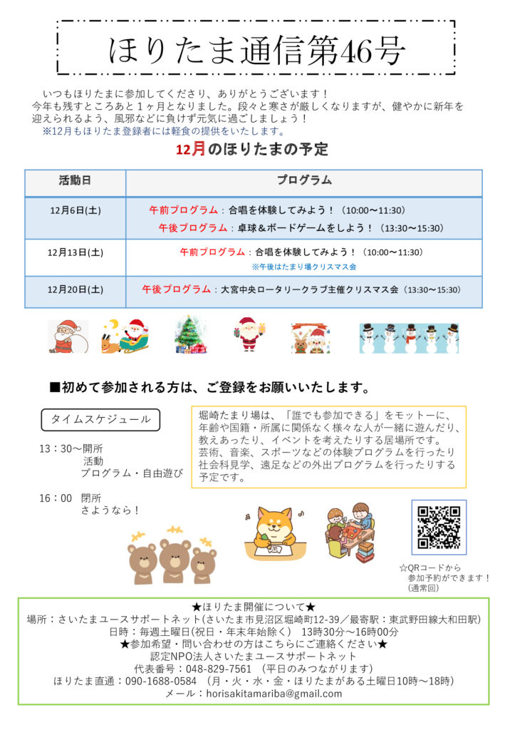 ※12/20(土)が今年最後のほりたま活動日になります。この日は大宮中央ロータリークラブの方々主催のクリスマス会を行います。