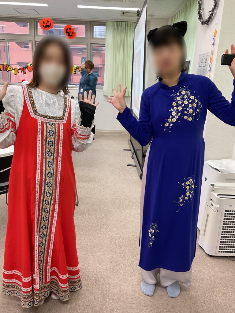 仮装として民族衣装を埼玉県国際交流協会様よりお借りし、各国の衣装を着て楽しみました!