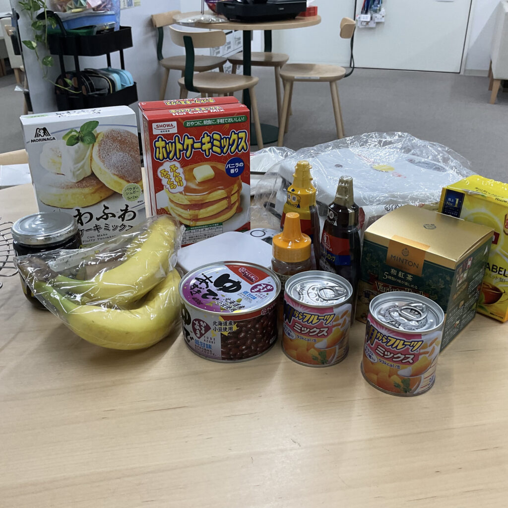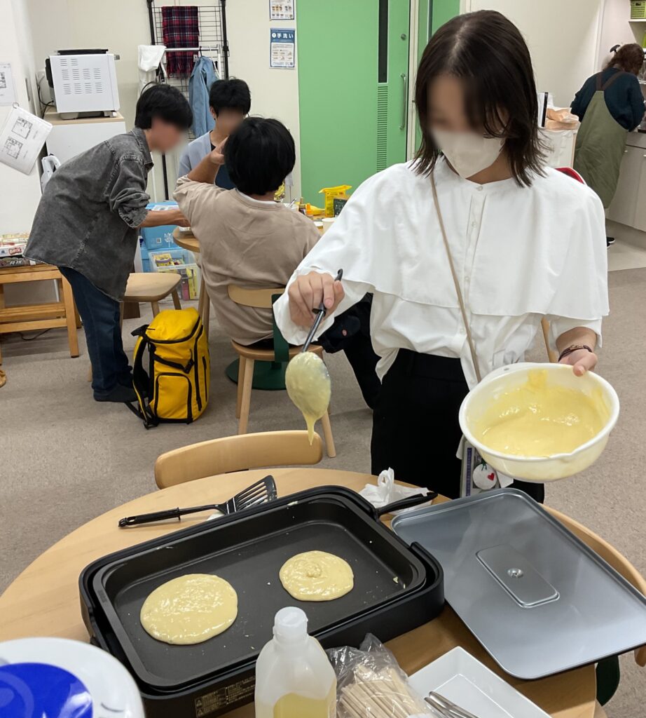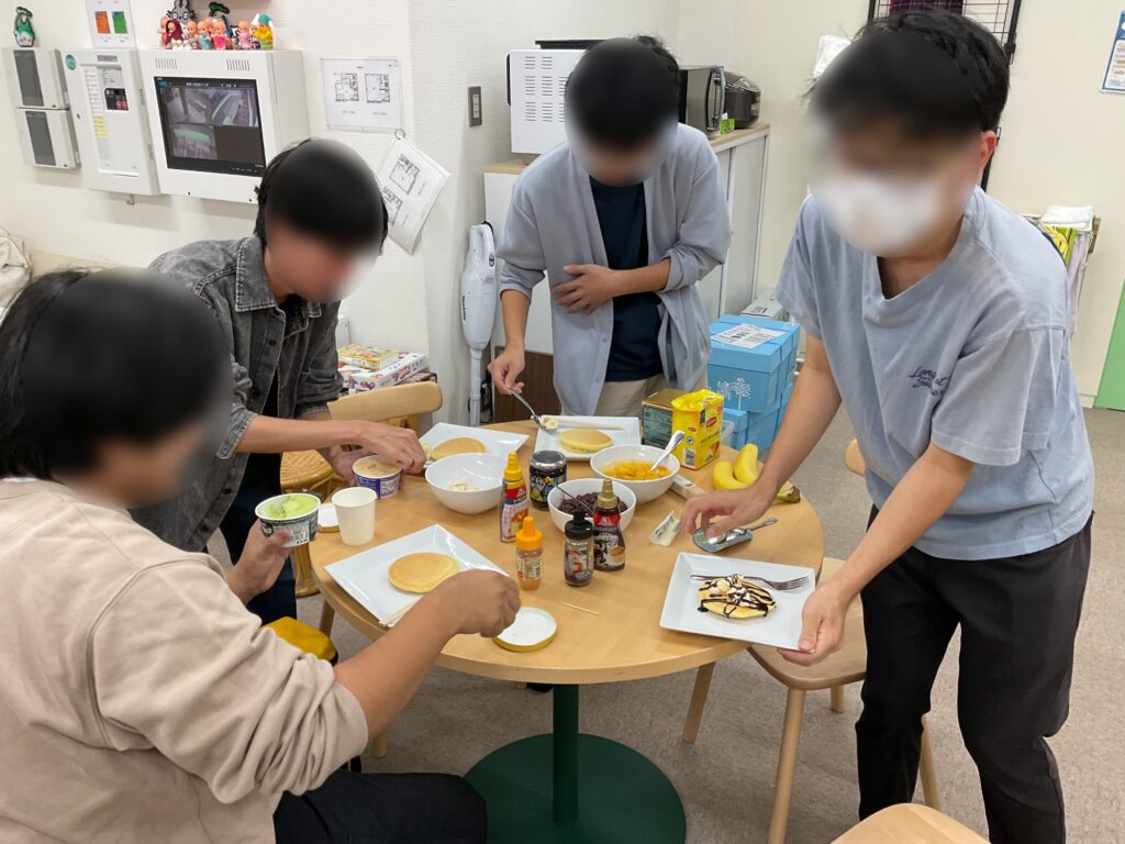 ホットプレートで譲り合いながら楽しく焼きました。デコレーションもオンリーワンを目指して楽しみ、「盛り付け上手だね」と利用者間で誉めあう姿もありました