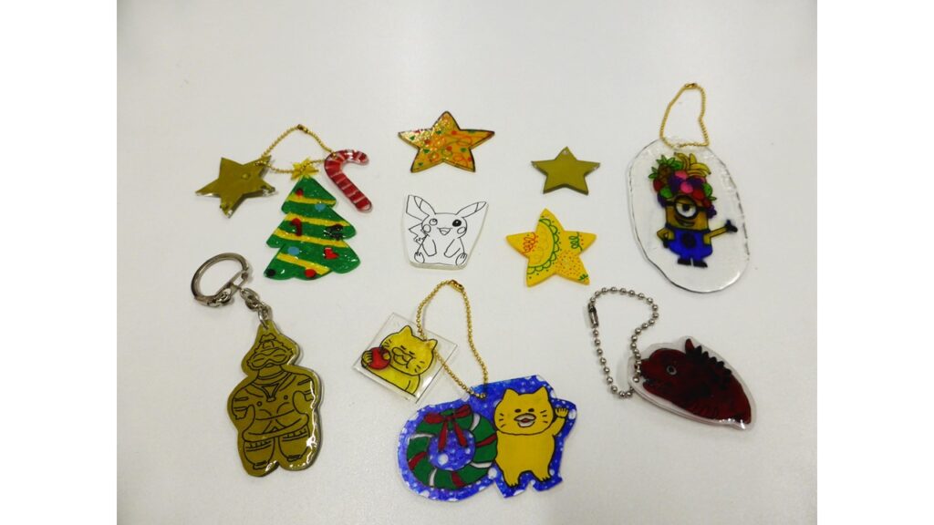 プラバンでキーホルダーを作りました!各々好きな絵を描いて、焼いた後レジンを塗ってみました🌟