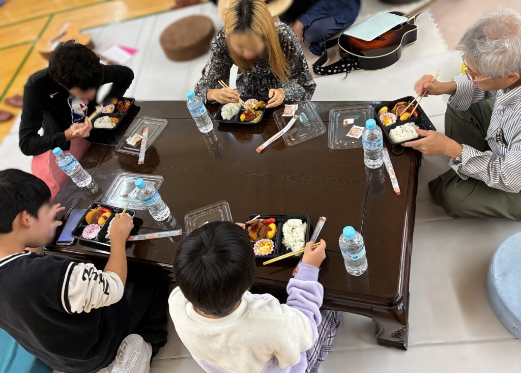 異年齢・異性の複数人が一つの机を囲み、みんなで一緒にお弁当を食べる光景はとても微笑ましく、にぎやかで温かな時間が流れていました。