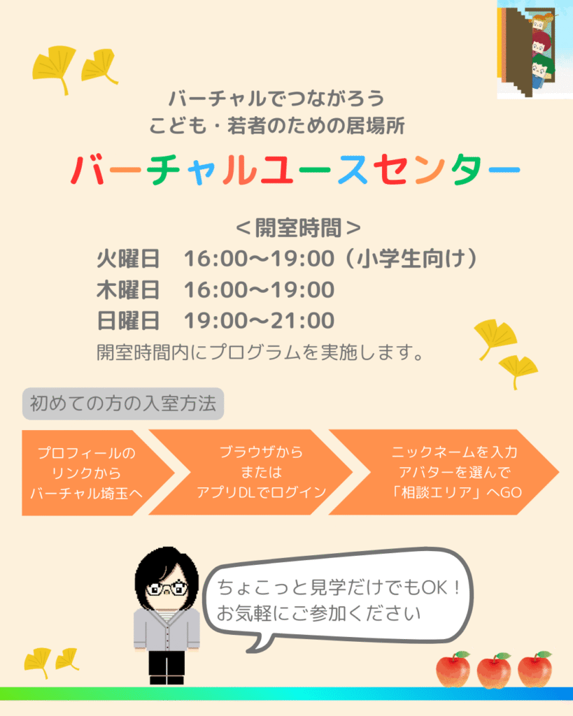 【埼玉県バーチャルユースセンターは、埼玉県の委託により認定NPO法人さいたまユースサポートネットが運営しています】