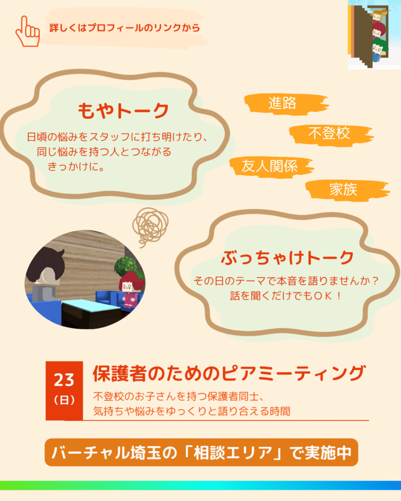 不登校のお子さんを持つ保護者同士、気持ちや悩みをゆっくりと語り合える。